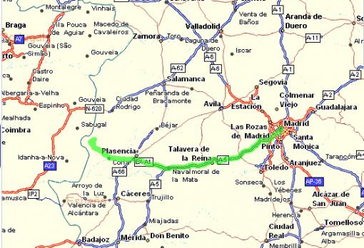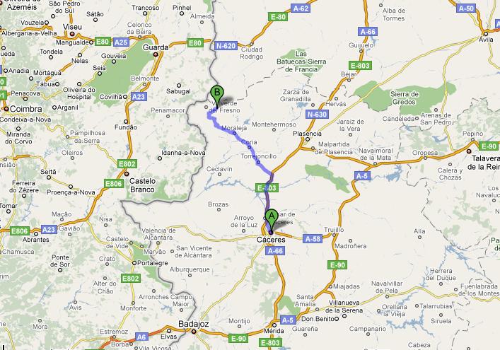 A-66/E-803 en dirección Cañaveral/Plasencia/Salamanca 0,4 km Incorpórate a E-803/A-66 33,1 km Toma la salida 505 hacia N-630/Grimaldo/Torrejoncillo/EX-371 0,3 km Gira ligeramente a la izquierda en Ctra de Cañaveral a Casas de Millán 0,3 km En la rotonda, toma la tercera salida e incorpórate a EX-371 en dirección Coria/Torrejoncillo 12,5 km Gira a la derecha en Ctra de Torrejoncillo a Portezuelo/EX-109 Continúa hacia EX-109 ( Pasa una rotonda) 14,6 km Gira a la izquierda para continuar por EX-109 14,5 km Gira ligeramente a la derecha 95 m Gira a la izquierda en EX-109 0,9 km En la rotonda, toma la primera salida 5,7 km Continúa recto hacia Ctra de la Moraleja 6,2 km Gira ligeramente a la derecha 30 m Gira a la izquierda en Av de la Virgen de Navelonga 1,0 km Gira ligeramente a la derecha en Av de la Pica 1,2 km Sigue por Ctra de Cilleros a Valverde 4,3 km Gira a la izquierda en Ctra de Valverde del Fresno a Hervás/EX-205 Continúa hacia EX-205 Salamanca