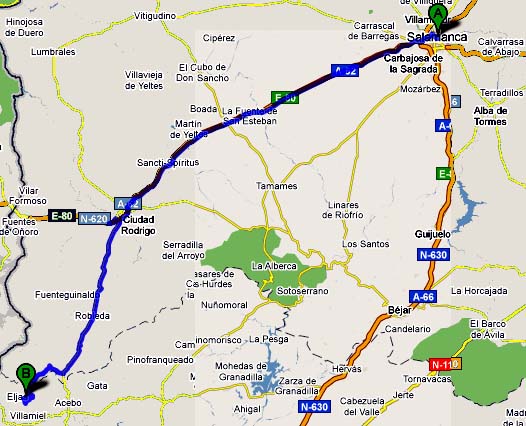 Salimos de Salamanca por el ramal E-80/A-62 en dirección Cáceres/A-66/E-803/Portugal 0,3 km Incorpórate a E-80/A-62 88,4 km Toma la salida 332 hacia SA-200, en dirección Ciudad Rodrigo/CL-526/Cáceres/Ituero de Azaba 0,3 km En la rotonda, toma la primera salida e incorpórate a N-620a/SA-200 en dirección Ciudad Rodrigo/CL-526/Cáceres/N-620 2,0 km Gira a la derecha en CV-35 0,9 km Gira a la derecha en CL-526 12,6 km Gira a la derecha en Ctra de Fuenteguinaldo al Bodón/CV-85 40 m Gira a la izquierda para continuar por Ctra de Fuenteguinaldo al Bodón/CV-85 23 m Gira a la derecha en CL-526/Ctra de Cáceres a Ciudad Rodrigo Continúa hacia CL-526 27,3 km Gira a la derecha en Ctra del Payo al Acebo/DSA-370