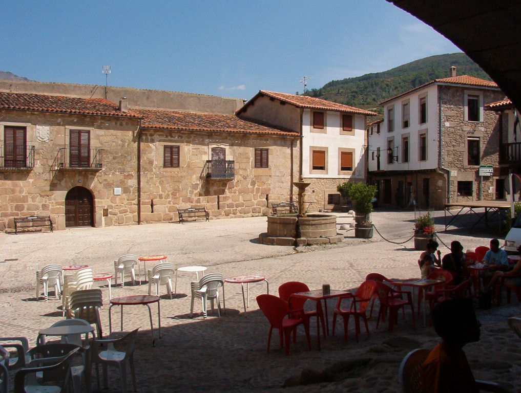 Plaza Mayor Porticada y fuente o pilón en el centro.
